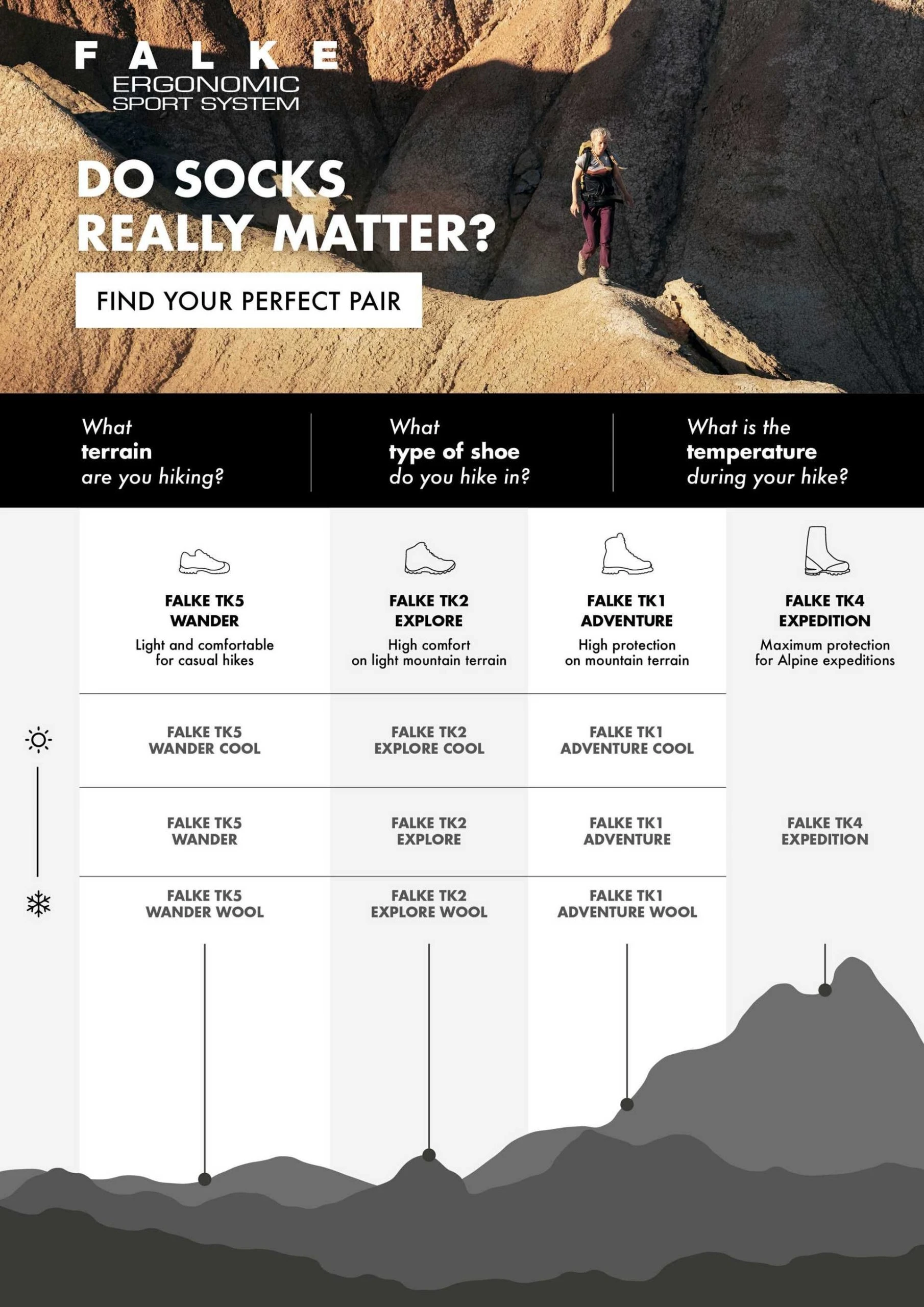 Denne udgave af Falke TK2 vandresokkerne passer til børn og er strikket til vandring i lettere terræn og med oppakning, der maks. vejer 5 – 10 kg. Sokkerne er derfor ideelle til f.eks. Caminovandring, Hærvejen og forlængede weekend- og dagsture.